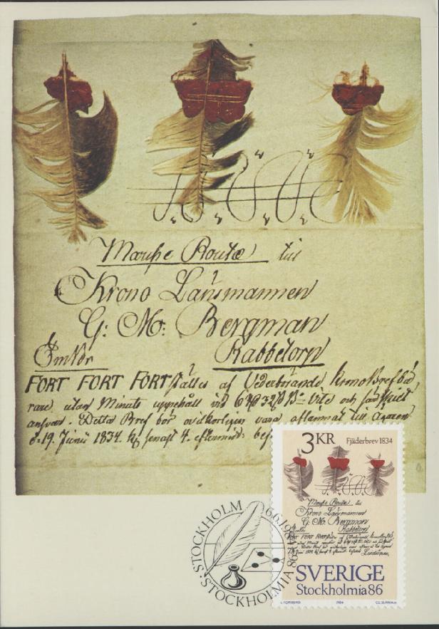 Si tratta della spedizione di lettere urgenti in Svezia, nel periodo pre-filatelico. Fra il 17xx ed metà del 1800 le lettere urgenti (oggi diremmo le lettere espresso) venivano chiuse con un sigillo di ceralacca in cui veniva inserita una piuma ad indicare l'urgenza della consegna. Due piume indicavano un messaggio più urgente e tre un messaggio urgentissimo. Ci sono rimaste varie lettere à la plume coi i sigilli della Royal Crown (le onde e la corona stilizzata è visibile nella parte in alto della cartolina maximum. la Svezia ha ricordato questa modalità di inoltro con un bel francobollo che riporta tre piume nel 1984: