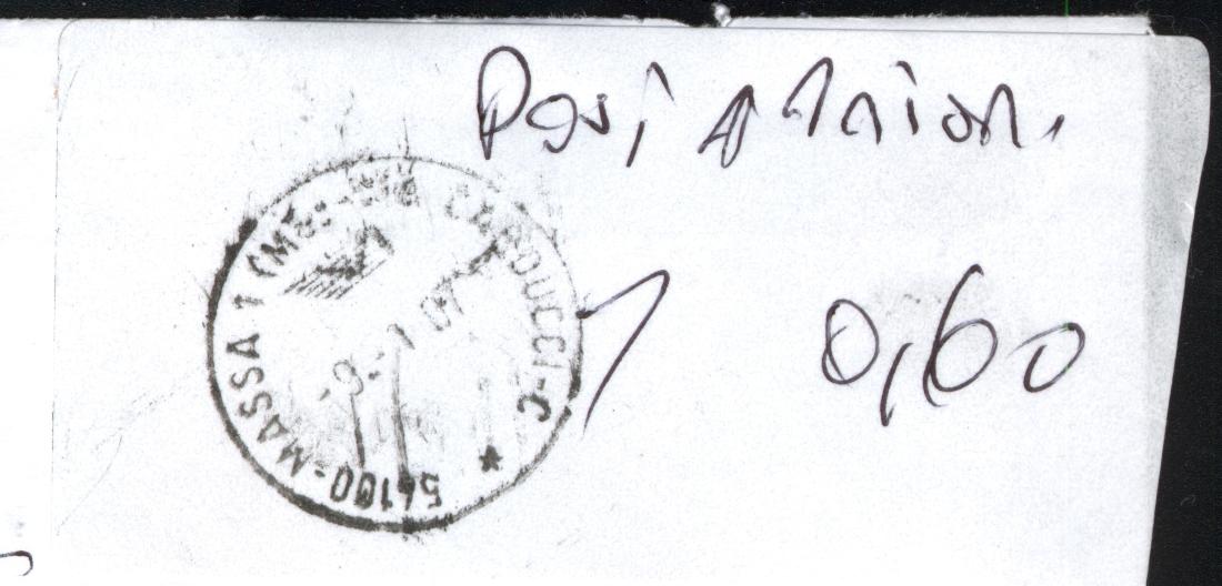 Ma perché vi faccio vedere questo lontano esempio? Perché anche ai nostri giorni, nell'epoca in cui orribili TP label hanno sostituito negli uffici postali i nostri commemorativi (con soddisfazione delle Poste, che possono risparmiare sulla distribuzione dei francobolli negli uffici periferici), può succedere che vengano a mancare i francobolli... (PARDON, che si guasti la macchinetta che emette quelle orribili etichette!) E quindi il moderno post master deve ricorrere a qualche soluzione di ripiego. Ecco che cosa ha fatto l'impiegato o il direttore dell'ufficio di Massa Carrara a inizio gennaio 2007: